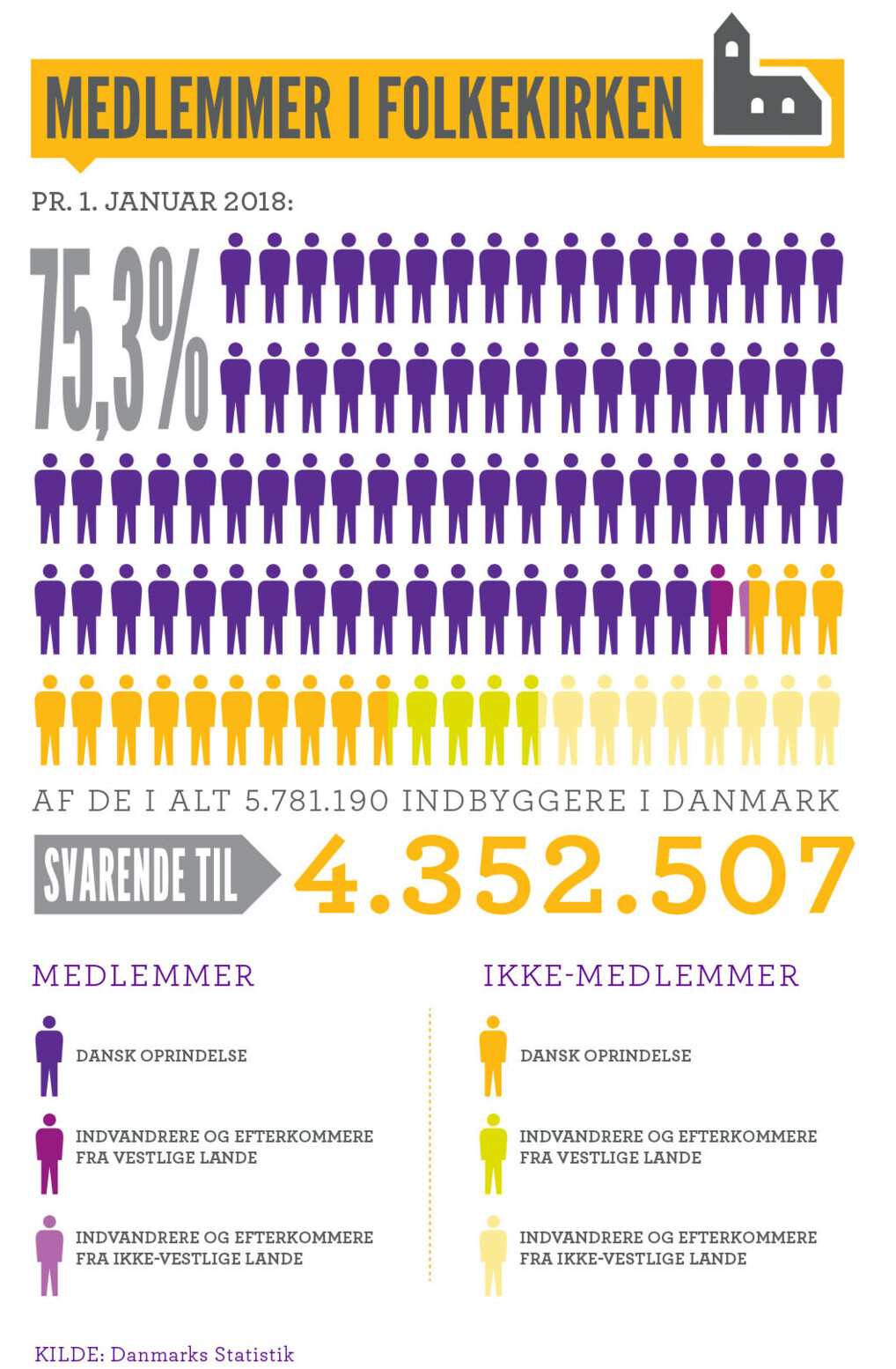 Folkekirkens medlemsprocent faldt i 2017 0,6 procentpoint. Omkring halvdelen af dem, der står uden for folkekirken, er indvandrere og deres efterkommere. 85,6 procent af borgere med dansk oprindelse er medlemmer.