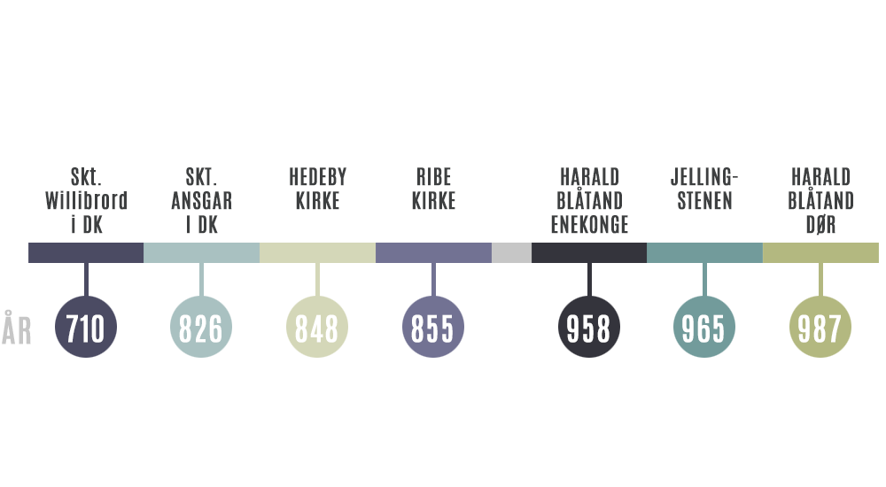 Siden Vikingetiden har Jellingstenen stået som et vidnesbyrd om, at den danske kong Harald Blåtand var den mand, der omkring år 965 kristnede danerne. Mejslet i stenen står: ’Kong Harald bød gøre disse kumler efter Gorm, sin fader, og efter Thyre, sin moder, den Harald som vandt sig hele Danmark og Norge og gjorde danerne kristne’. Men hvis vi kaster et nærmere blik på historiens gamle skrifter og nyere arkæologiske fund, så bliver vi klar over, at kristendommen kom til Danmark allerede 100 år før Harald Blåtand, og sandsynligvis gjorde sit spæde indtog endnu tidligere.